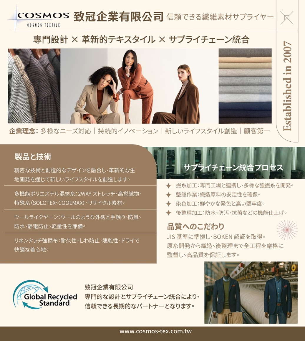 The Power of Design 布料不僅是材料,更是風格與態度的展現。我們將專業工藝與時尚語彙融合,打造專屬於新世代的面料語言。
